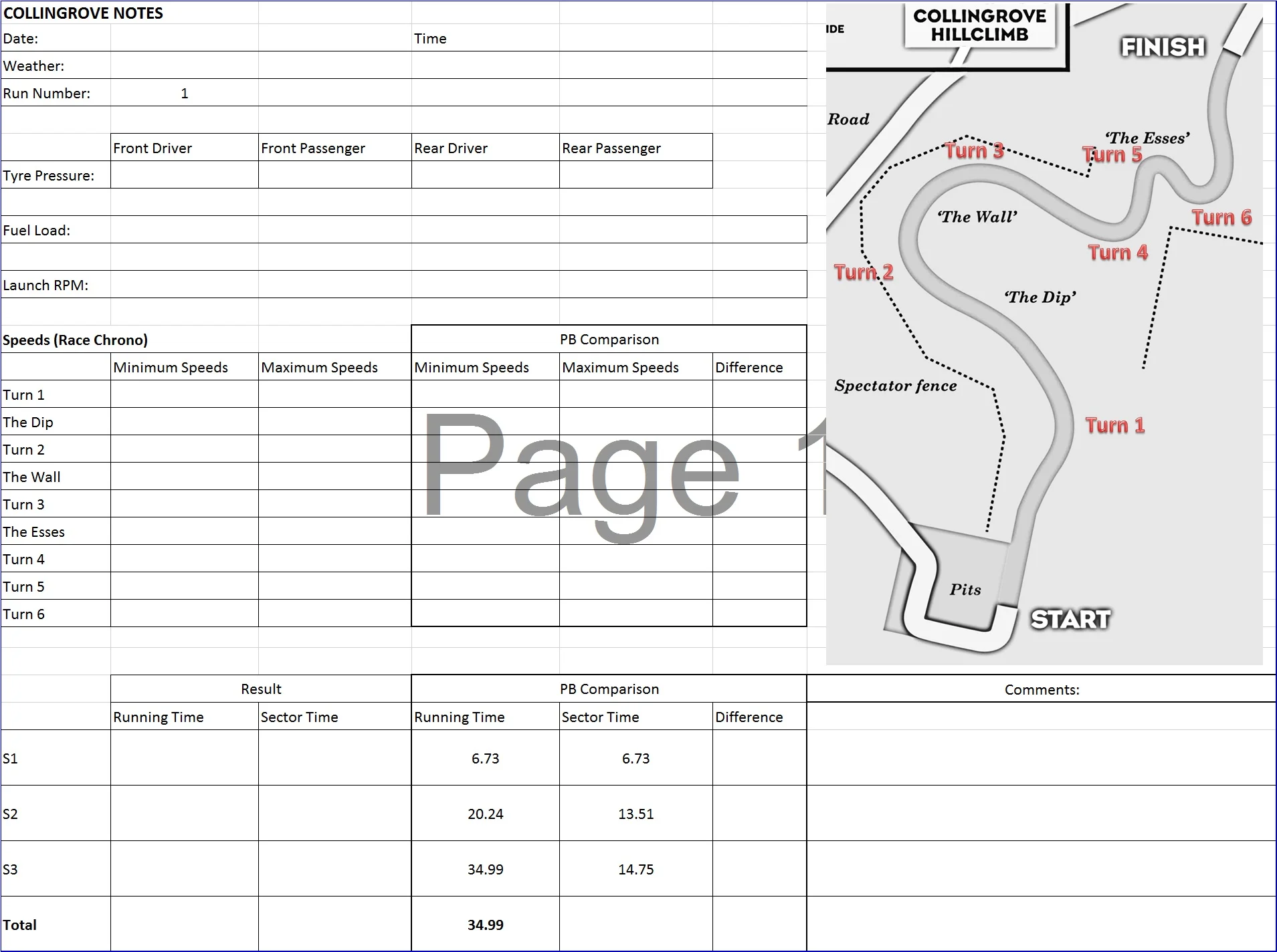 As it turned out my record sheet was a bit too detailed, and I found that I was not really taking the time to fill it in fully after each run. I got the main details in but didn't end up really reviewing the information until after the event had finished. This should still be very helpful, as I now have notes on each section of the course that should help me to quickly get up to speed next time I visit Collingrove.